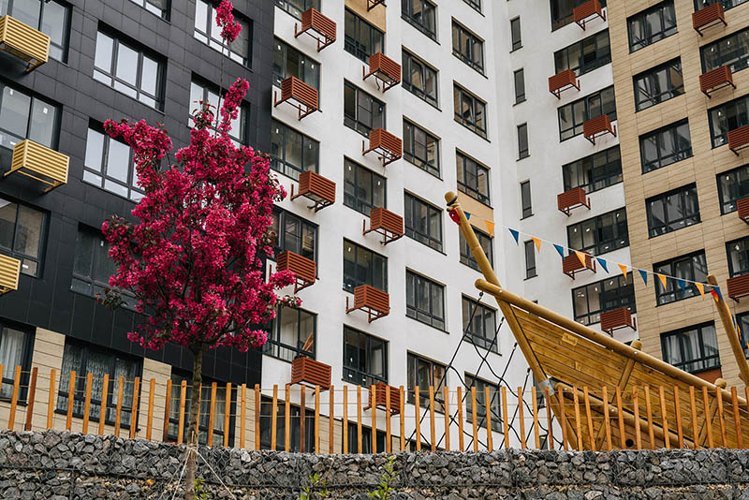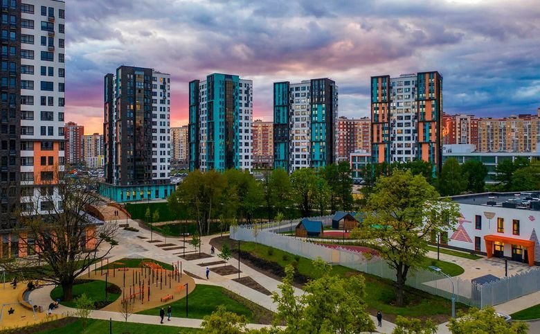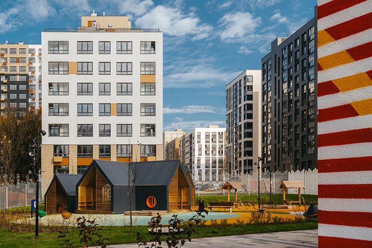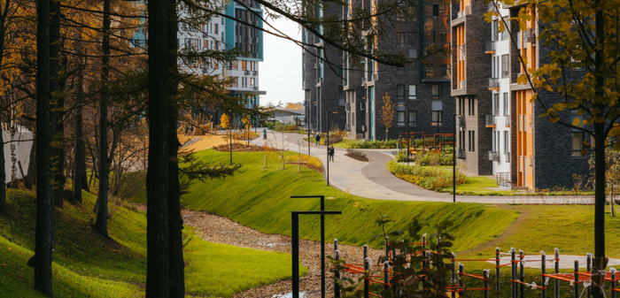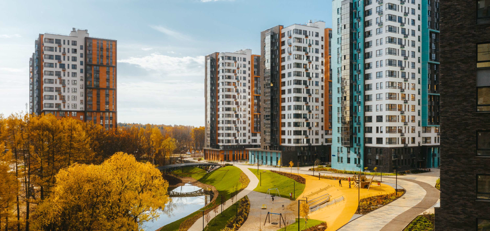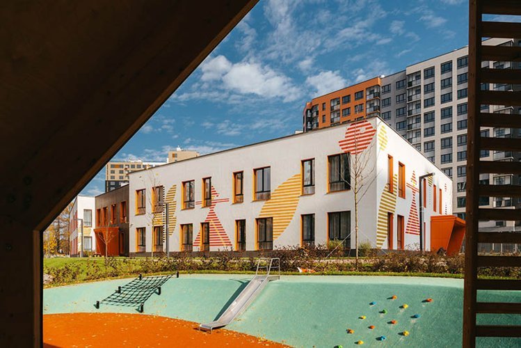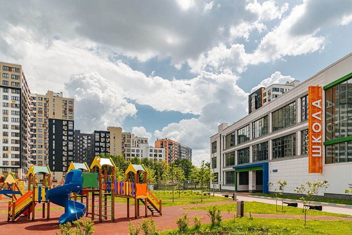 Жилой квартал включает в себя 19 корпусов высотой от 7 до 16 этажей. Навесные вентилируемые фасады светлых оттенков выполнены в лаконичном дизайне. Из окон открываются виды на зеленые зоны.