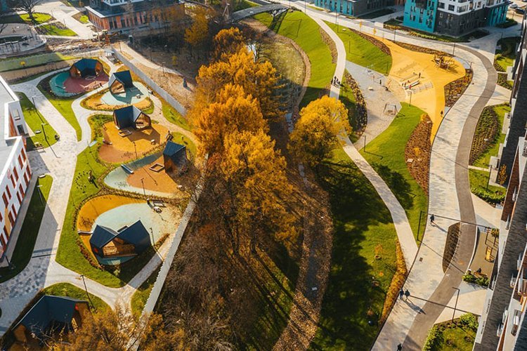 На территории жилого комплекса находится собственный парк для отдыха и спорта с 20 многовековыми дубами. Во дворе расположены прогулочная аллея и выезд на велосипедную дорожку длиной в 15 км. Напротив дома находятся благоустроенные зоны отдыха у ручьев и пруда.