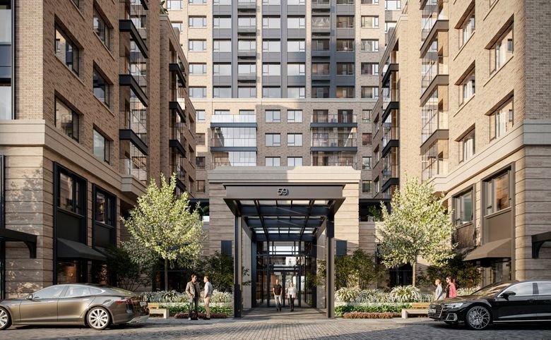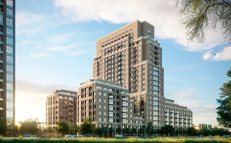 Жилой комплекс состоит из 12 разноэтажных секций высотой до 23 этажей и выполнен в стиле современного американского традиционализма. Трехчастный фасад облицован натуральным камнем, кирпичом, металлом и архитектурным бетоном. Центральный элемент ансамбля — выразительная 23-этажная башня. Ее обрамляют две симметричные невысокие секции, замыкающие квартал