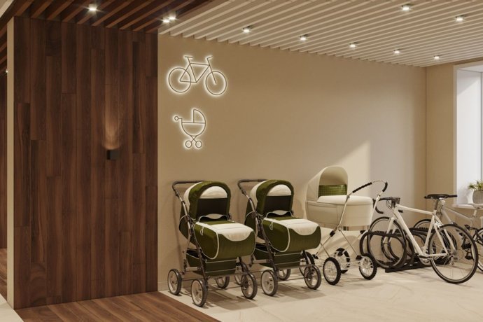 На первом этаже каждой секции предусмотрены колясочные, а уровнем ниже размещены техпомещения с креплениями для велосипедов.