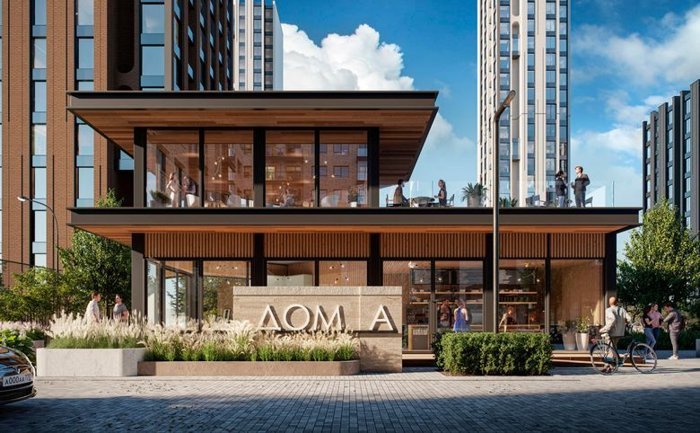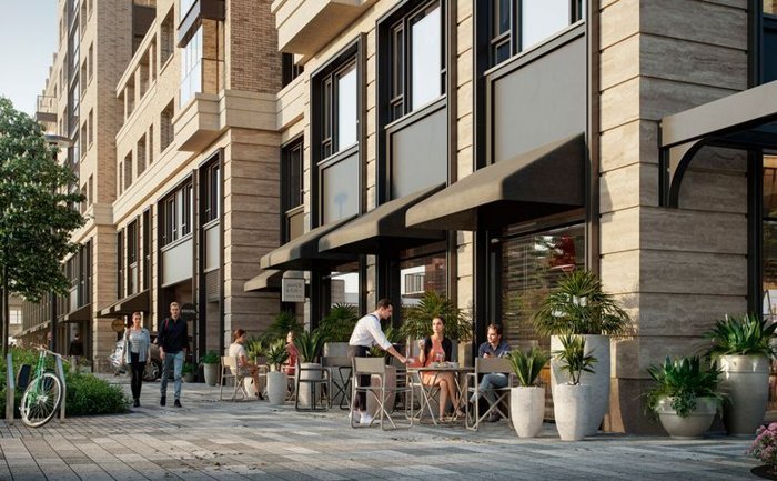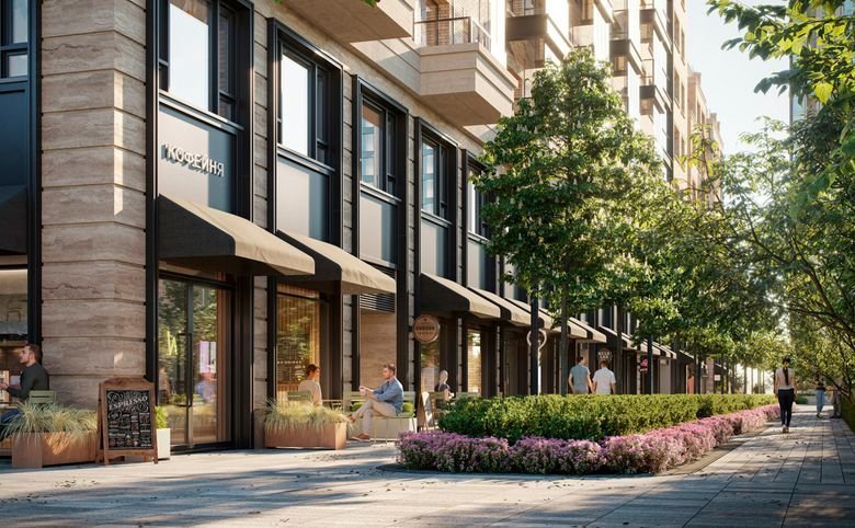На эксплуатируемых кровлях размещены общественные пространства. В инфраструктуру проекта входят 2 павильона с кафетерием и детским клубом, фитнес-студия, ресторан и винотека.